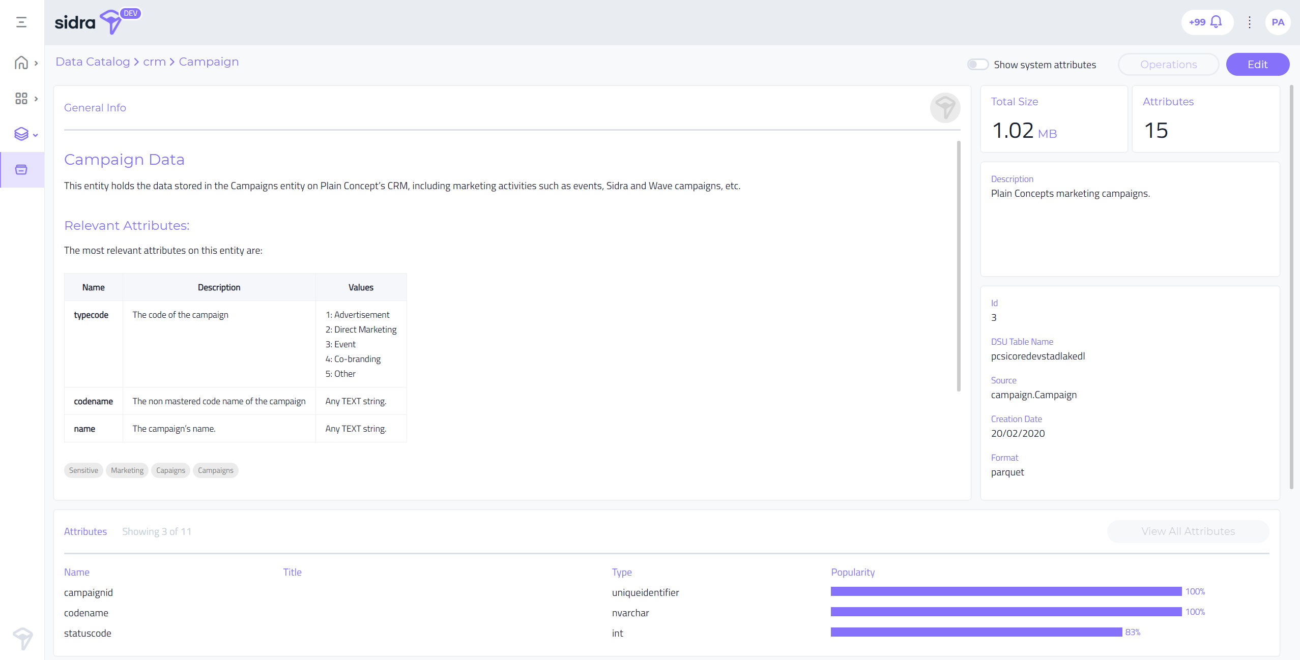 Entity metadata can now be populated from the UI, including support for entity documentation, tags, and a short description. In addition to that, the entity editor shows the attributes along with the attribute popularity, which is a measure of how often the specific attribute is retrieved by the Data Products in relation to the rest of the entity's attributes.