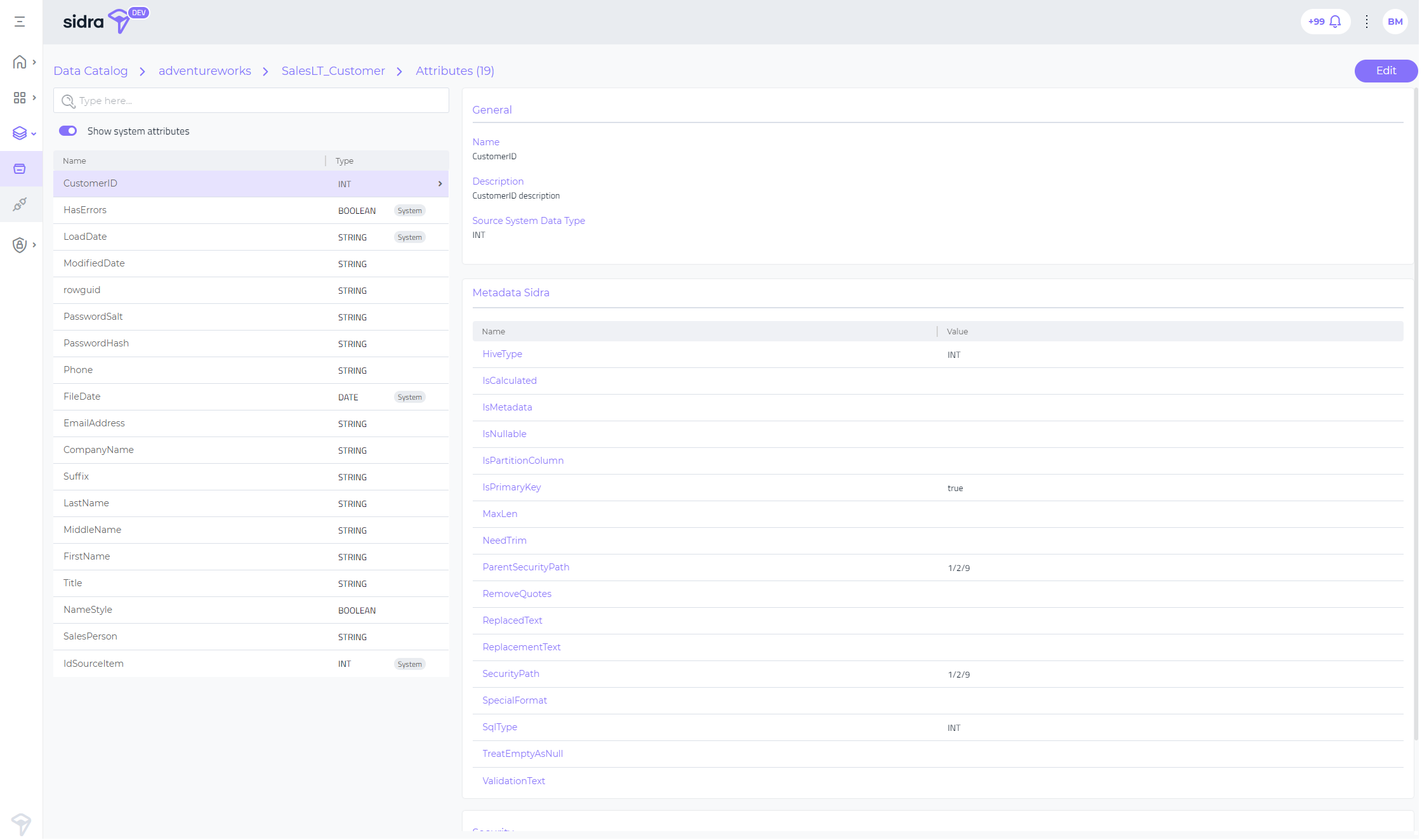 For each Attribute, the Attributes view allows to see all relevant fields organized in sub-sections: General, Metadata and Security.