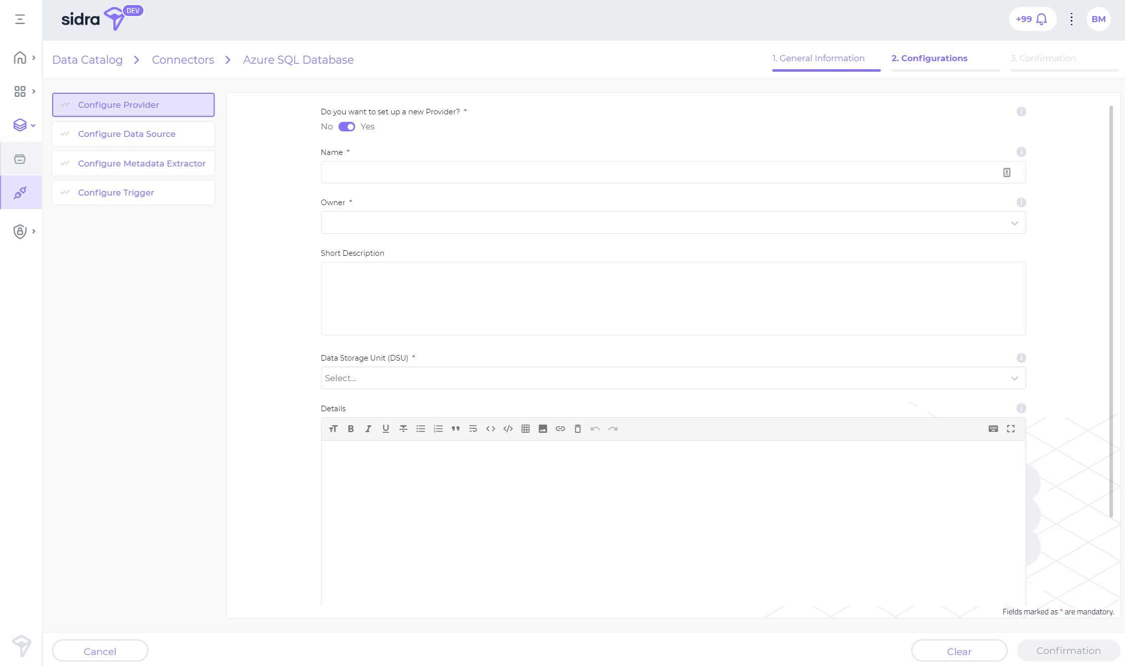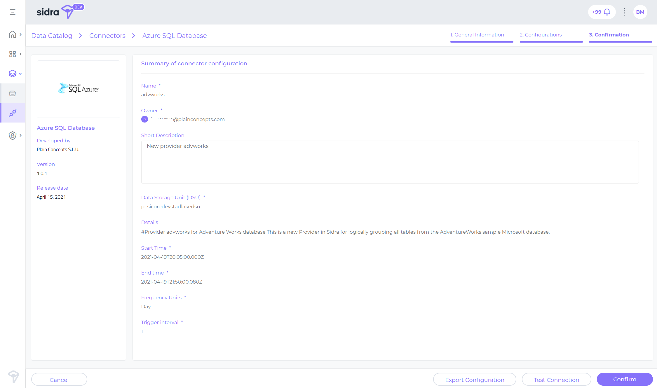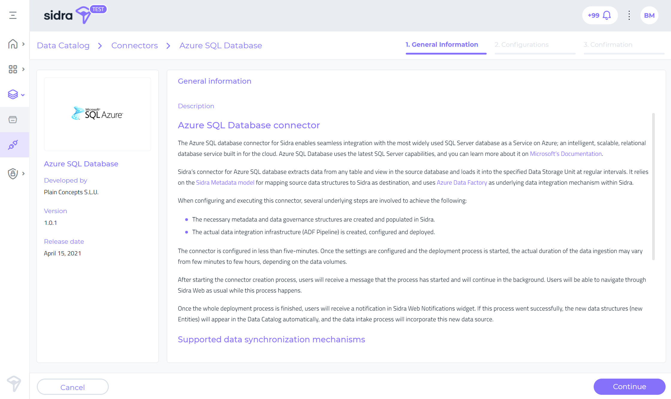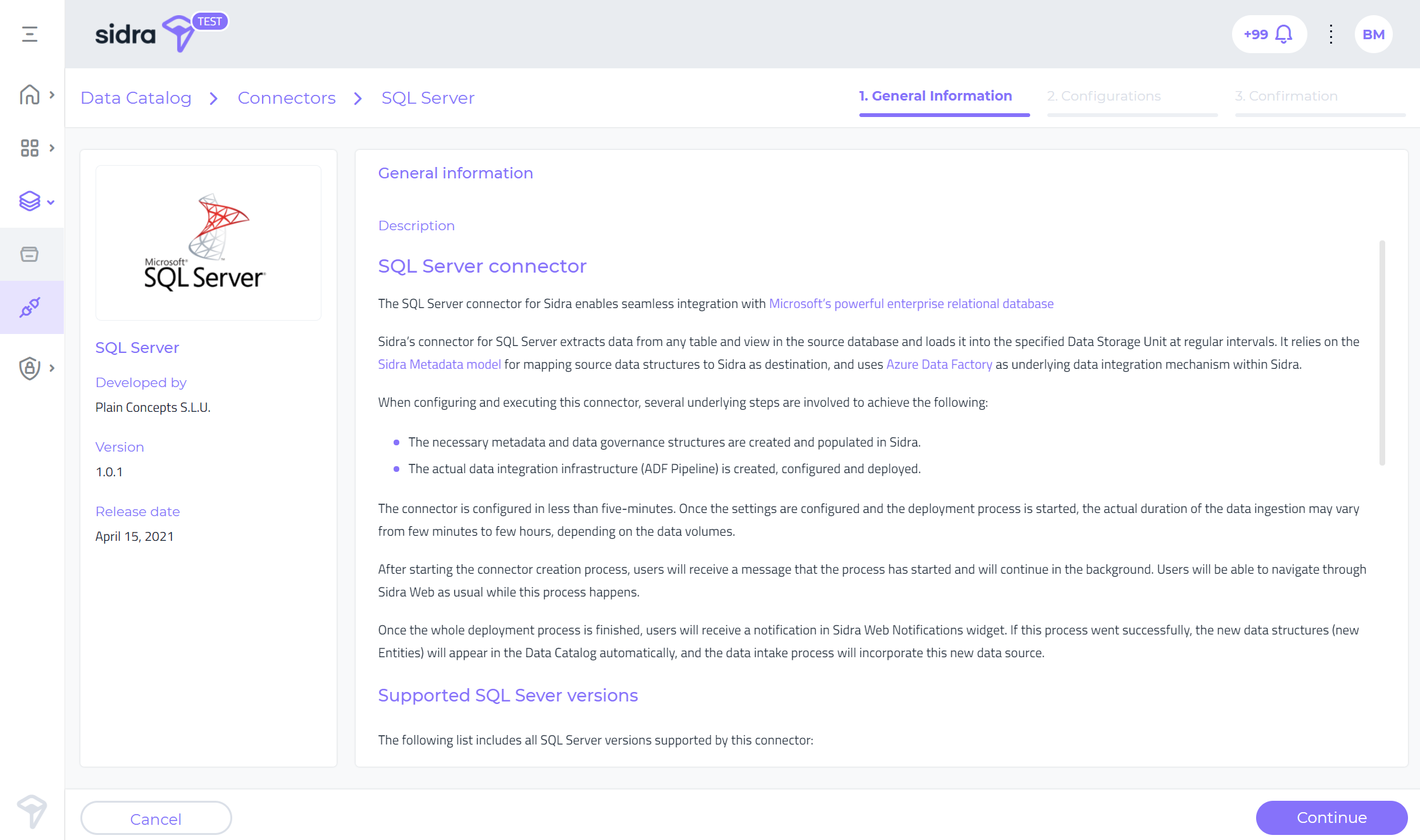 Data connectors UI support is a major feature whose key exponent is visible in the Sidra Web UI. Sidra connectors have been conceived with the purpose of adding more self-service capabilities to Sidra. This has been, and will continue to be, one of the key objectives of Sidra evolution as a product.
