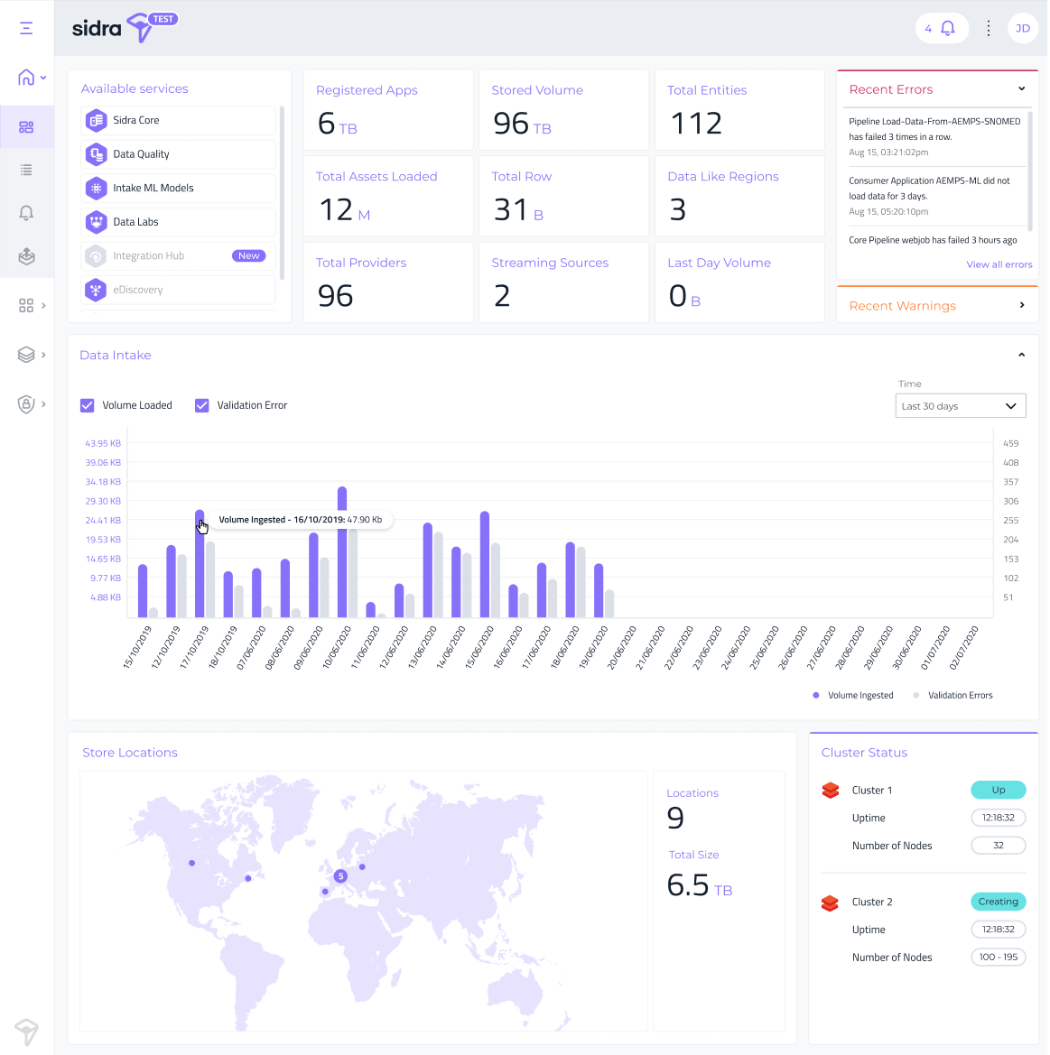 Sidra's Dashboard page has been redesigned, with improved utilization of real state for Data Intake graphs and Cluster status. An improved widget has been added for geo-visualization of the different Data Storage Units.