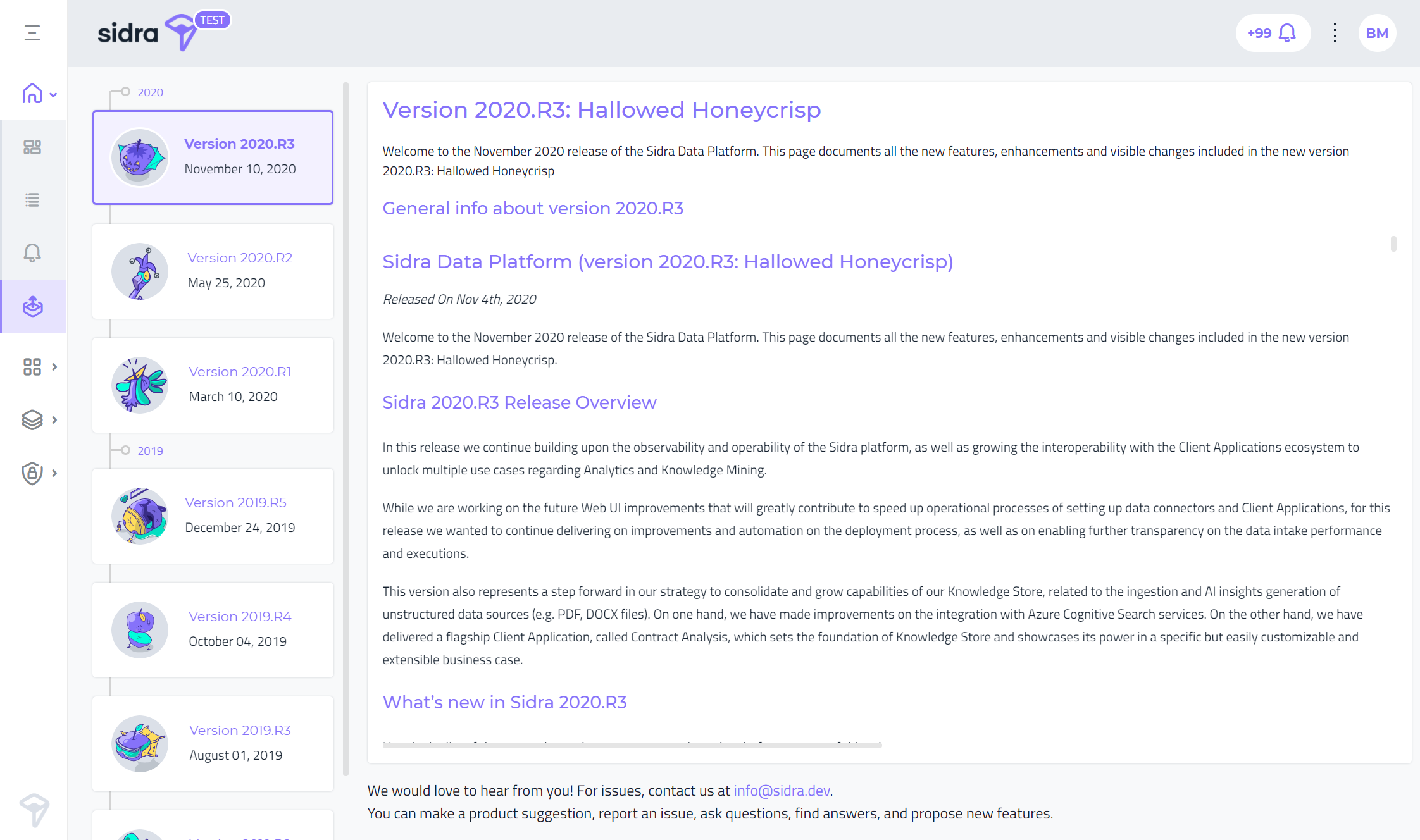 The Release notes page in Sidra web has been re-designed, with the objective of displaying a linear timeline of all the Releases of Sidra.