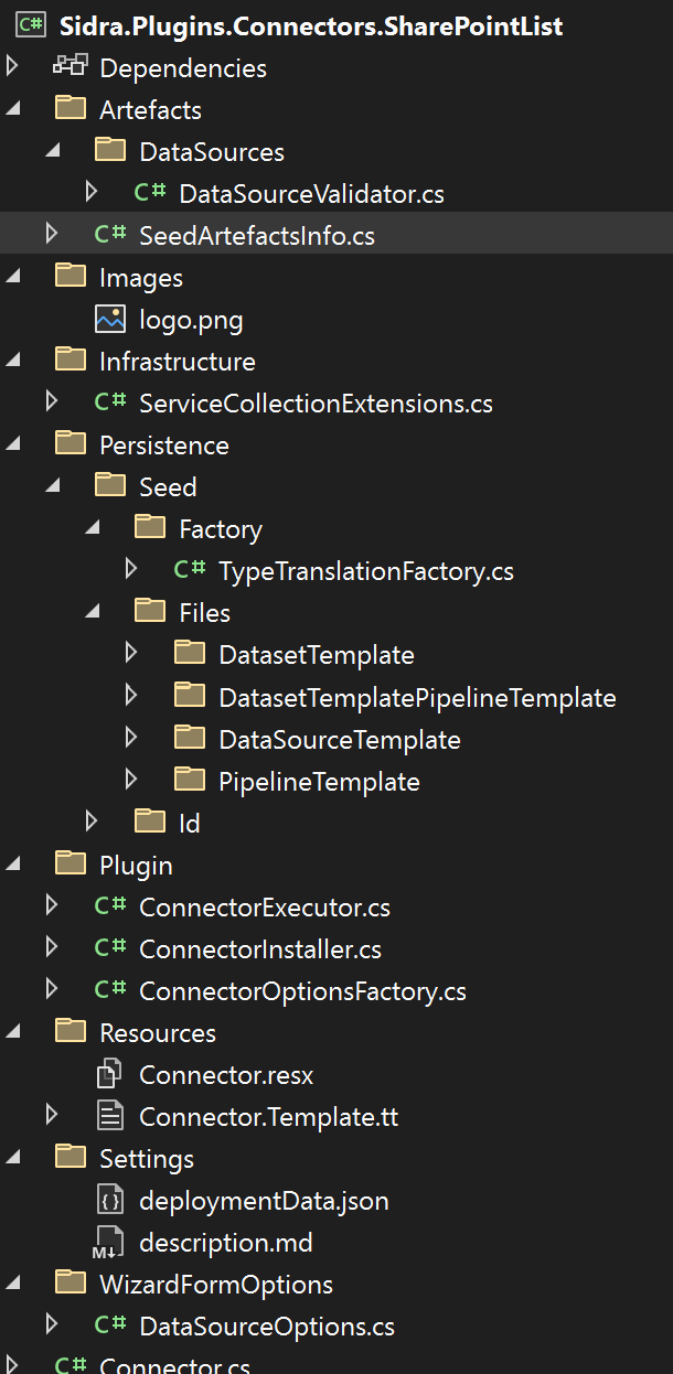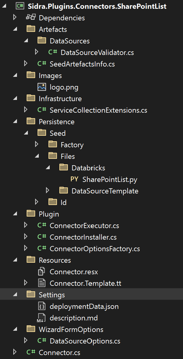 Artefacts/DataSources/DataSourceValidator.cs: contains the DataSource validation. The DataSource defines the origin of the data and, when using DataFactory, can be mapped to a Linked Server.Artefacts/SeedArtefactsInfo.cs: prepopulated list of the pipelines, data sources and dataset templates to be deployed. Each item should be assigned a different GUID.Images/logo.png: the logo of the connector to show in the gallery of Sidra Web.Infrastructure/ServiceCollectionExtensions.cs: Dependency Injection.Persistence/Seed: Databricks Notebooks and templates for Data Factory objects that this connector will create.Plugin/ConnectorExecutor.cs: This is the code that will be executed when the user creates a Data Intake Process using this connector. This code usually creates a Databricks Job or a Data Factory Pipeline. Note that, forDataFactoryPipelineDeploymentconnectors, this code is not executed.Plugin/ConnectorInstaller.cs: This is the code that will be executed when the connector is installed. Typically, it will register some Pipeline Templates in Core´s database or upload some notebook to the Databricks workspace.Plugin/ConnectorOptionsFactory.cs: Here you can configure the wizard pages. Each class included will be mapped to a page.DataSourceOptionsis included by default.Resources: Text resources for the connector.Settings/deploymentData.json: Metadata about the connector.Settings/description.md: A description of the connector to show in the connector wizard.WizardFormOptions/DataSourceOptions.cs: Parameters the user must introduce to configure the Data Source.Connector.cs: main class.
