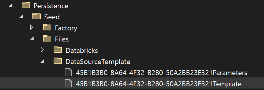 The structure of the connector will have some small differences depending on the parameterization. The first image below shows a Databricks connector while the following one shows a DataFactory connector. Note that the first one contains a Databricks notebook in Persistence/Seed/Files/ while the second contains a PipelineTemplate instead.