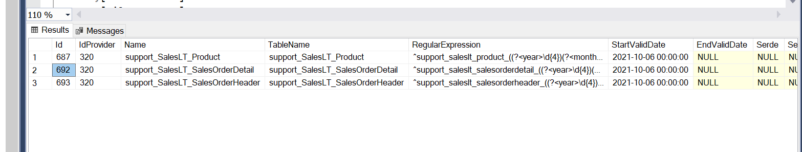 Once this data is synchronized with the Data Product, this is the data for the Data Product staging tables (Day 1, so AssetDate: 2021-11-10), as well as the number of rows: