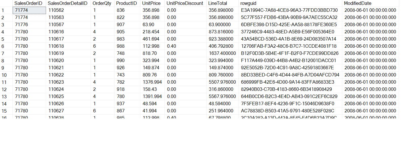 This table represents a sales order detail table, with several rows per order. Each field represents a property of a line item in each sales order. This table will be loaded with incremental load with Change tracking activated.