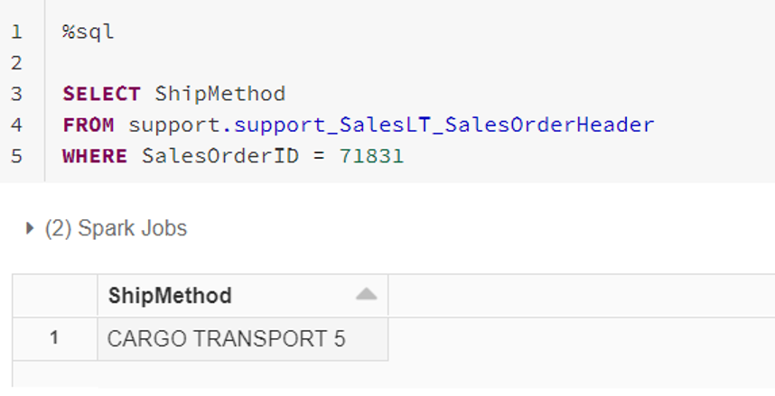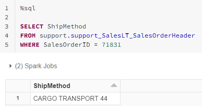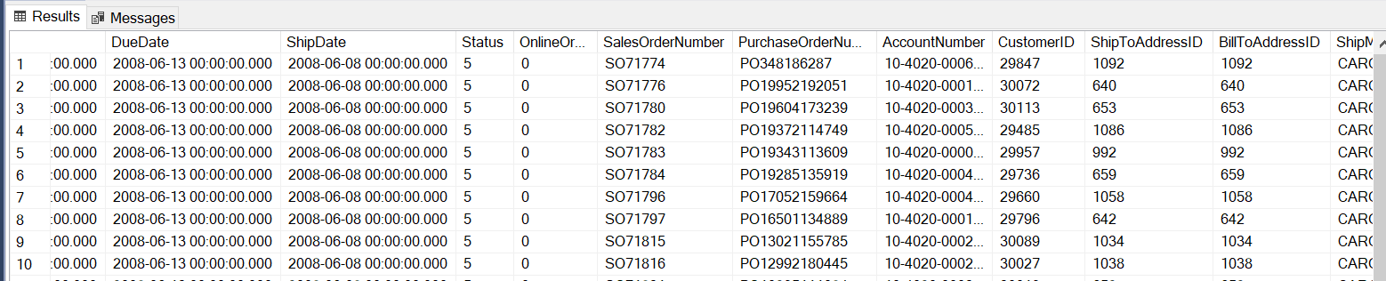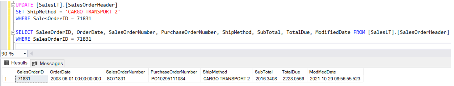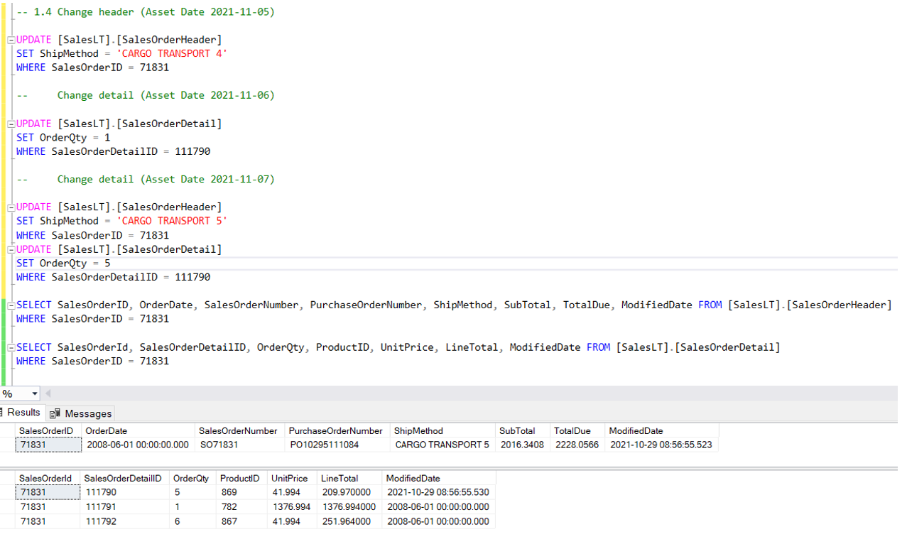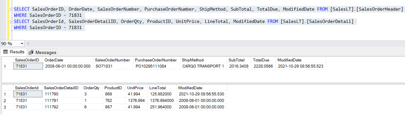 We can see that data in the Header table in the source has changed, but not the Detail table. We can see the changes in the ShipMethod column in the source system, in the SalesOrderHeader table.