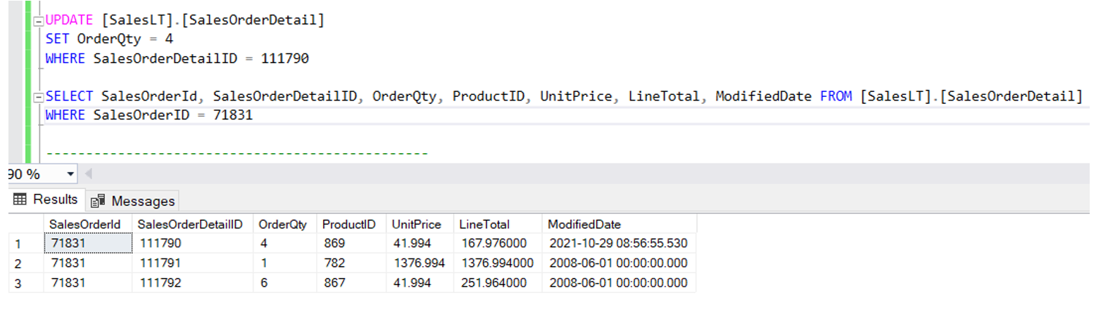 We can see the changes in the table OrderQty in the SalesOrderDetail table, the value has been set back to 4 from the original value of 3 for a specific SalesOrderDetailId.