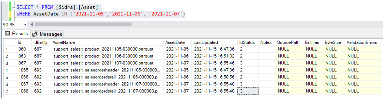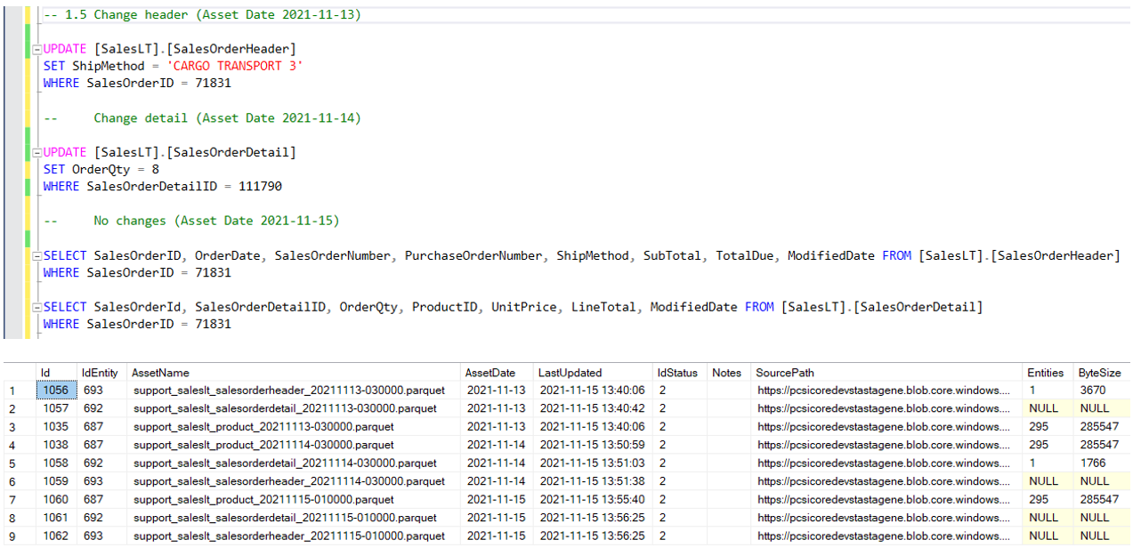 2021-11-08). An Asset is generated for Header, but not for Detail. However, the Sync will not execute the pipeline because there are no Assets for all the mandatory tables (Entities). - There are no changes for any table (Header nor Detail) on day 2 (AssetDate=