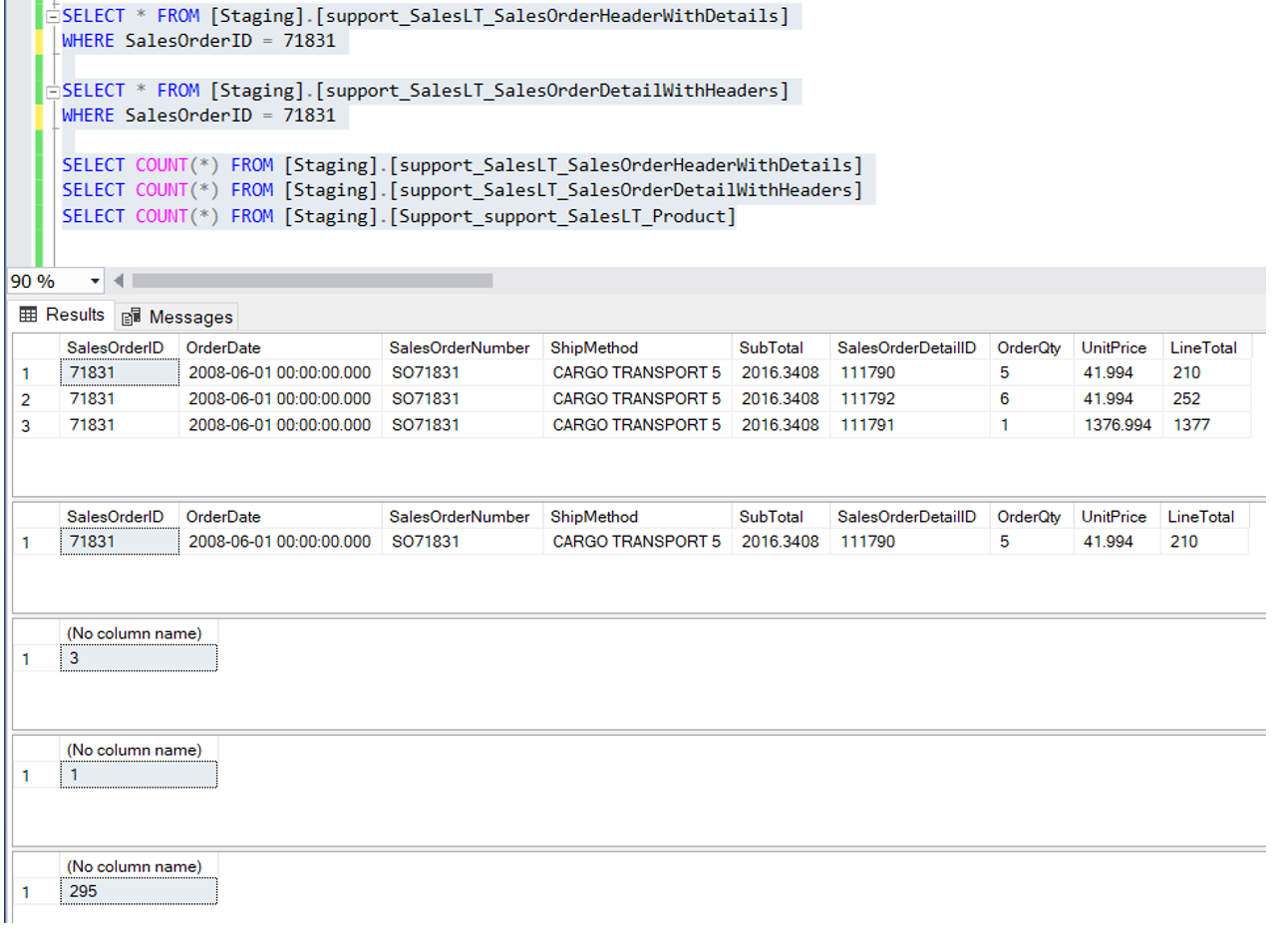 SalesOrderHeaderWithDetails, we have a total number of 3 records. This is because this table is generated by the left join of Headers on Detail. Headers has a change (therefore, the three Detail records associated to that Header), and Details also. - In the