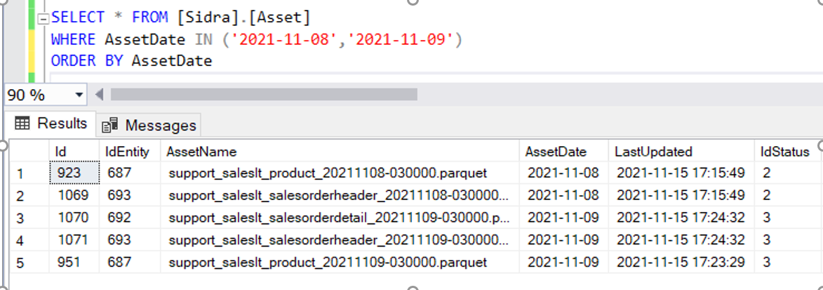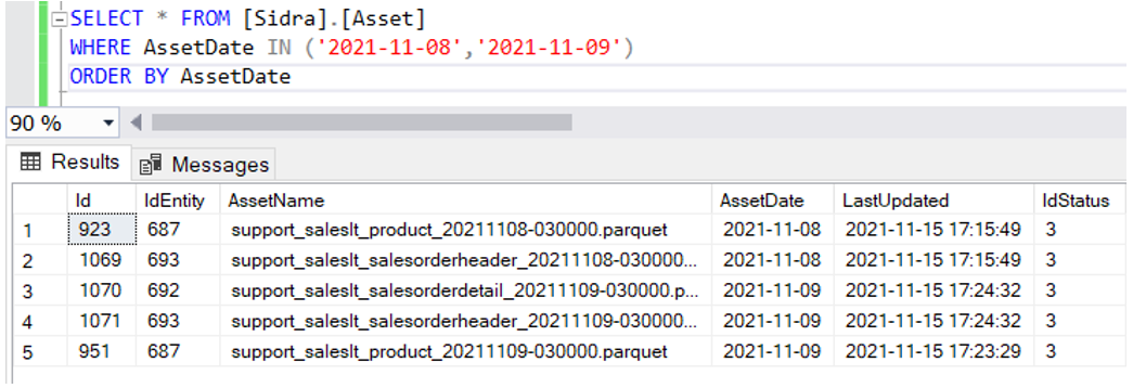 On Day 1 (AssetDate = 2021-11-19), we perform an initial load on Sidra Service on date 2021-11-10 for all three Entities.