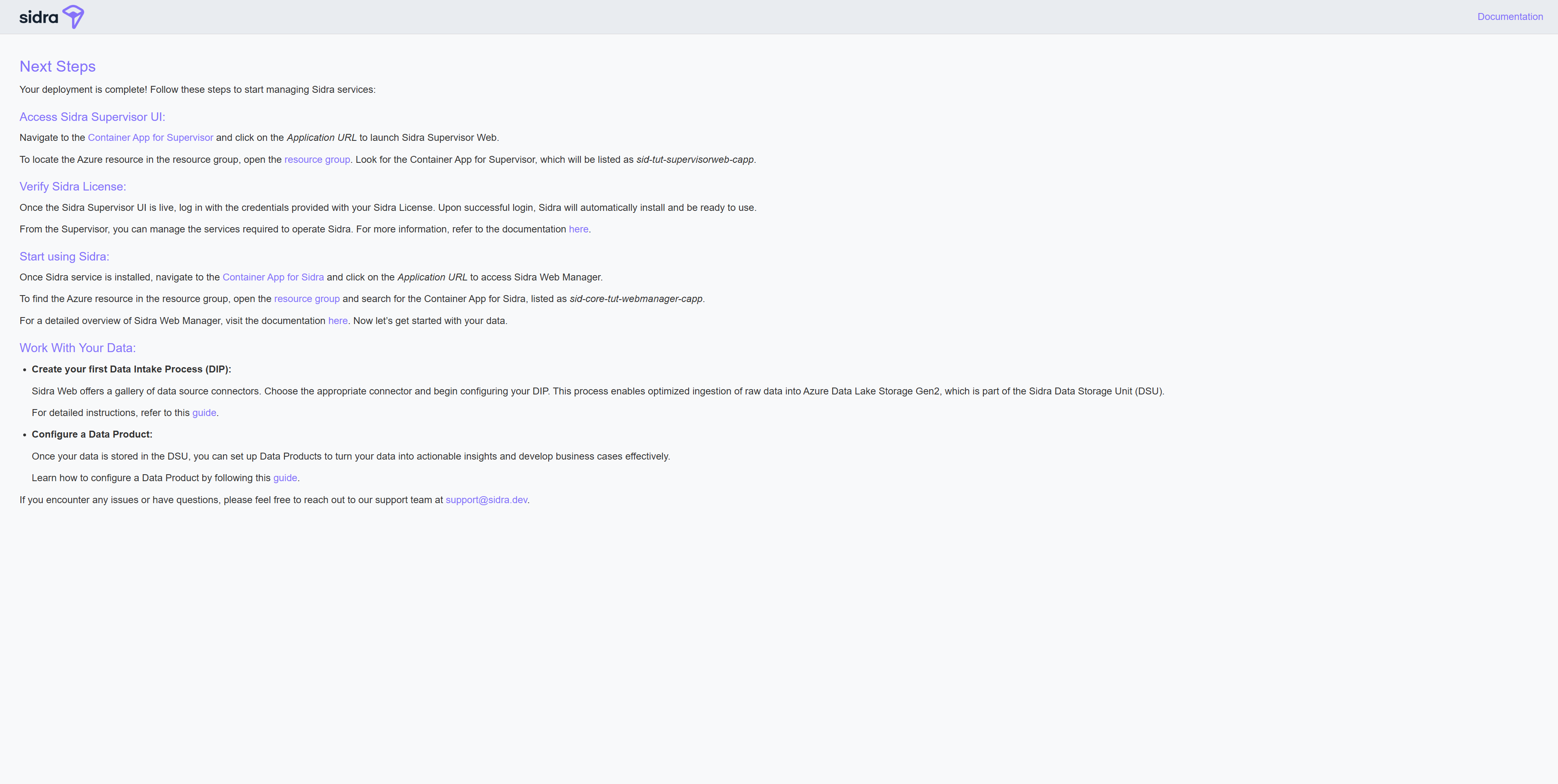 Now that your environment is up and running, you can start building value with Sidra. Here are a few key actions you can take next: