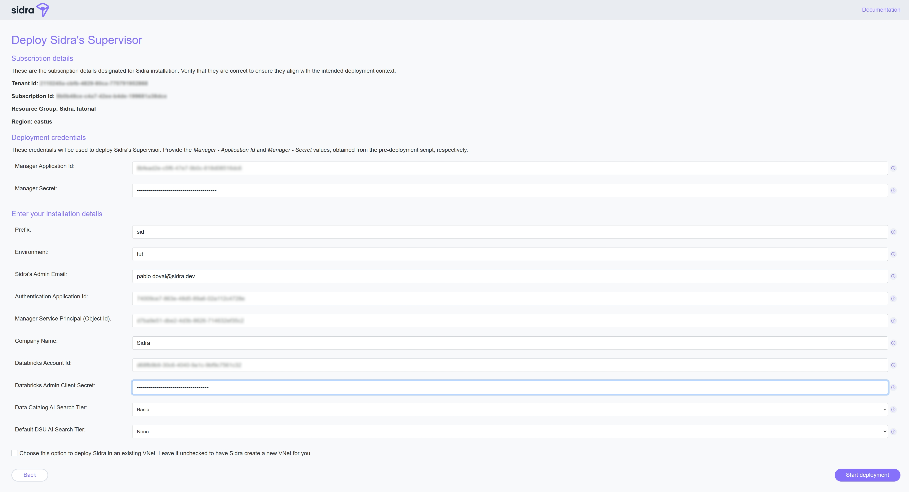 For this tutorial, we’ll deploy a new Sidra environment called Tutorial, using the following values: