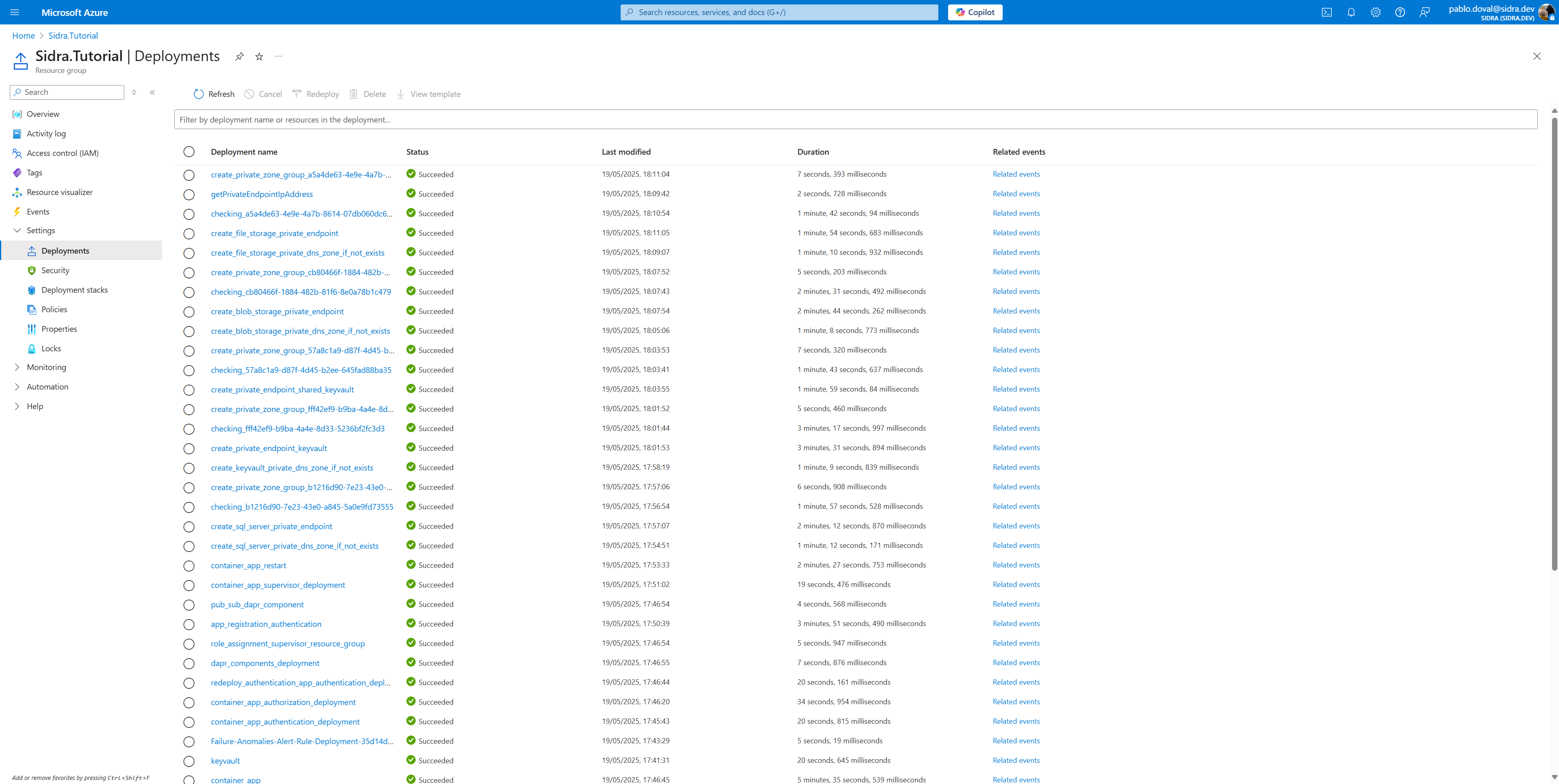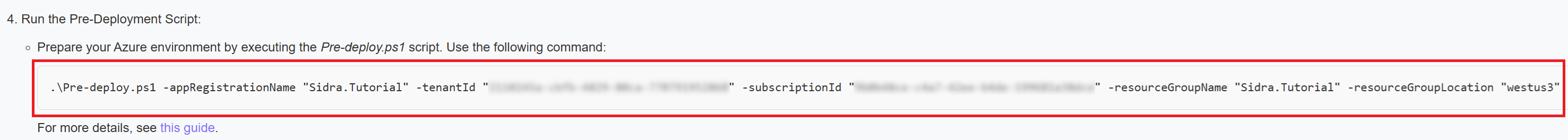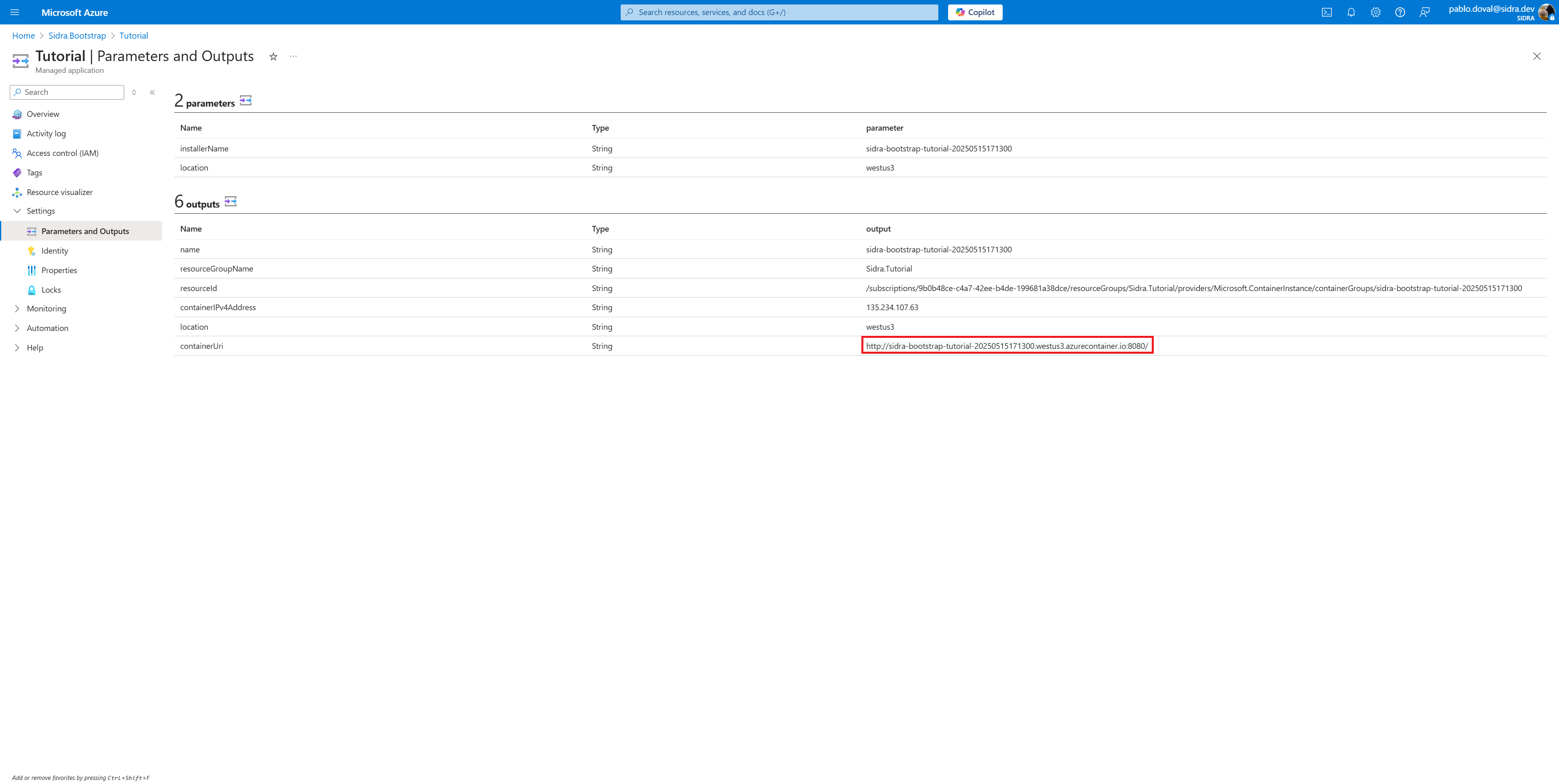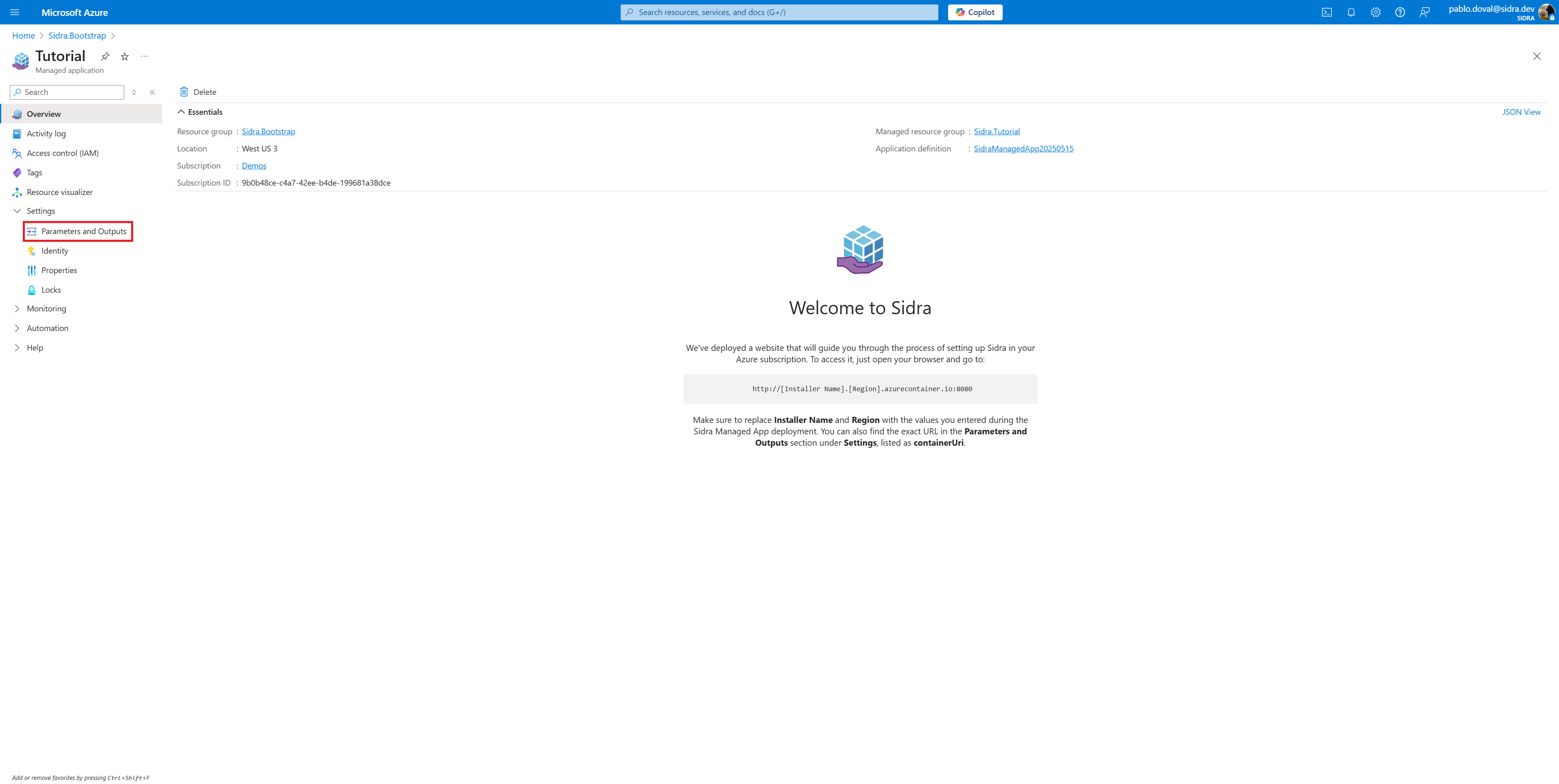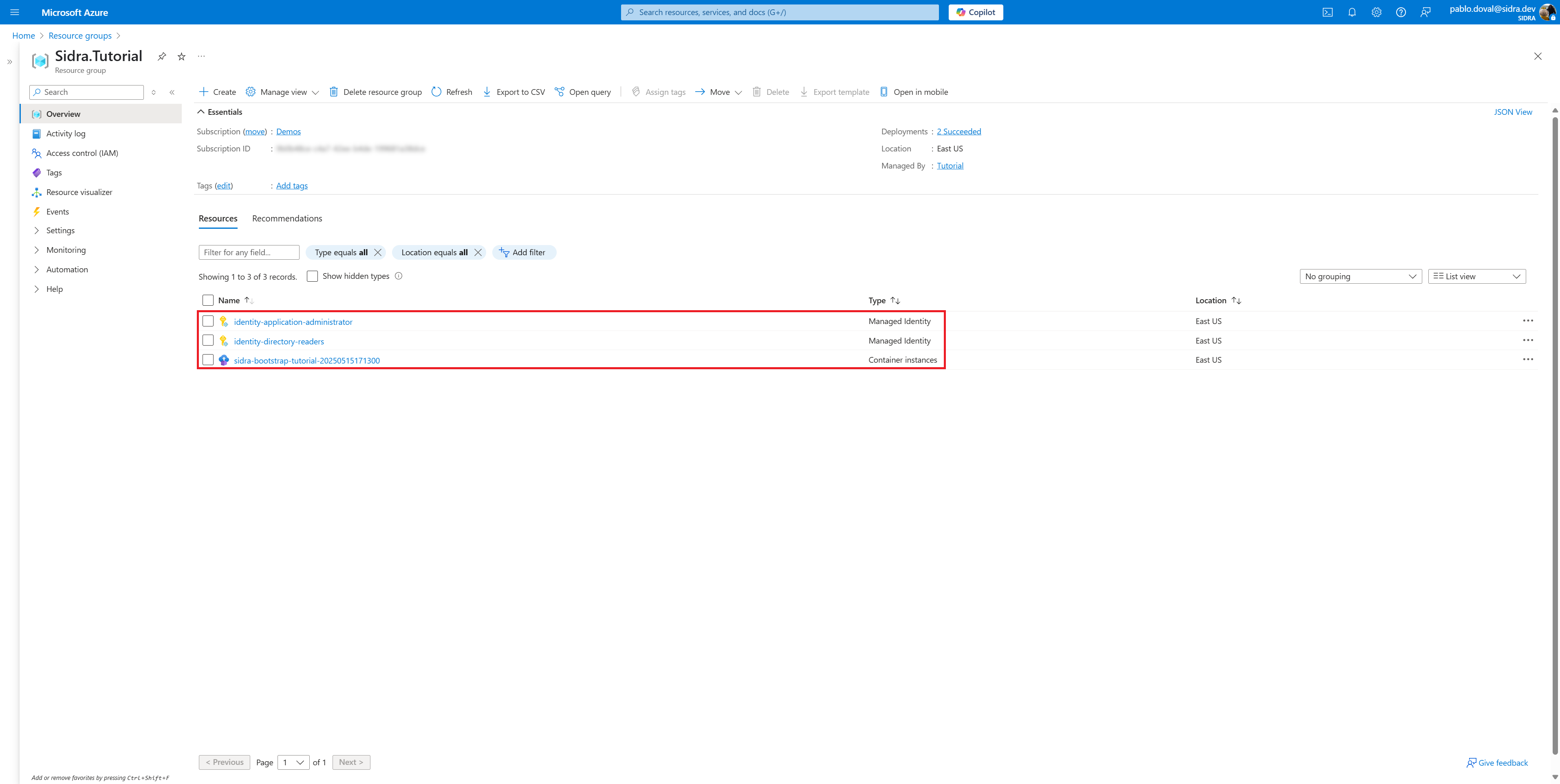 After execution, verify that the resource group Sidra.Tutorial was created and includes the expected pre-deployment assets.