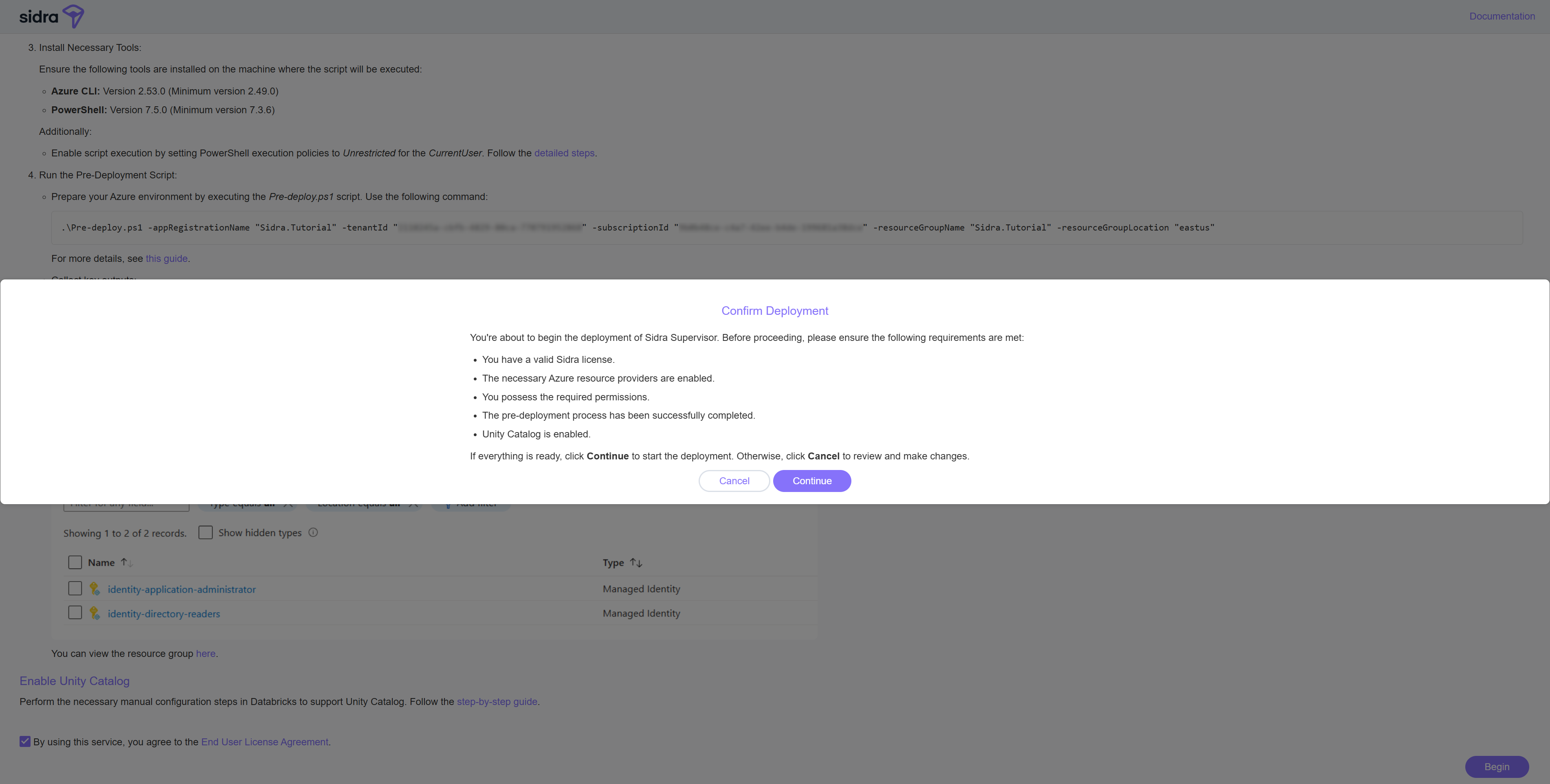 Deploying Sidra’s Supervisor involves provisioning and configuring a wide range of Azure resources. This step typically takes 30 minutes or more. While the bootstrapper will notify you when the process finishes, we strongly recommend using the provided deployment link to monitor progress in real time.