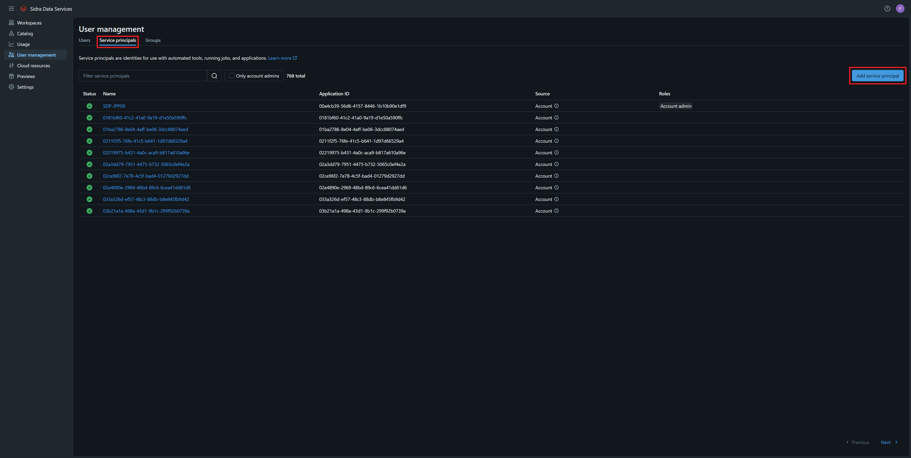 - Under the Service Principals tab, click Add service principal:
