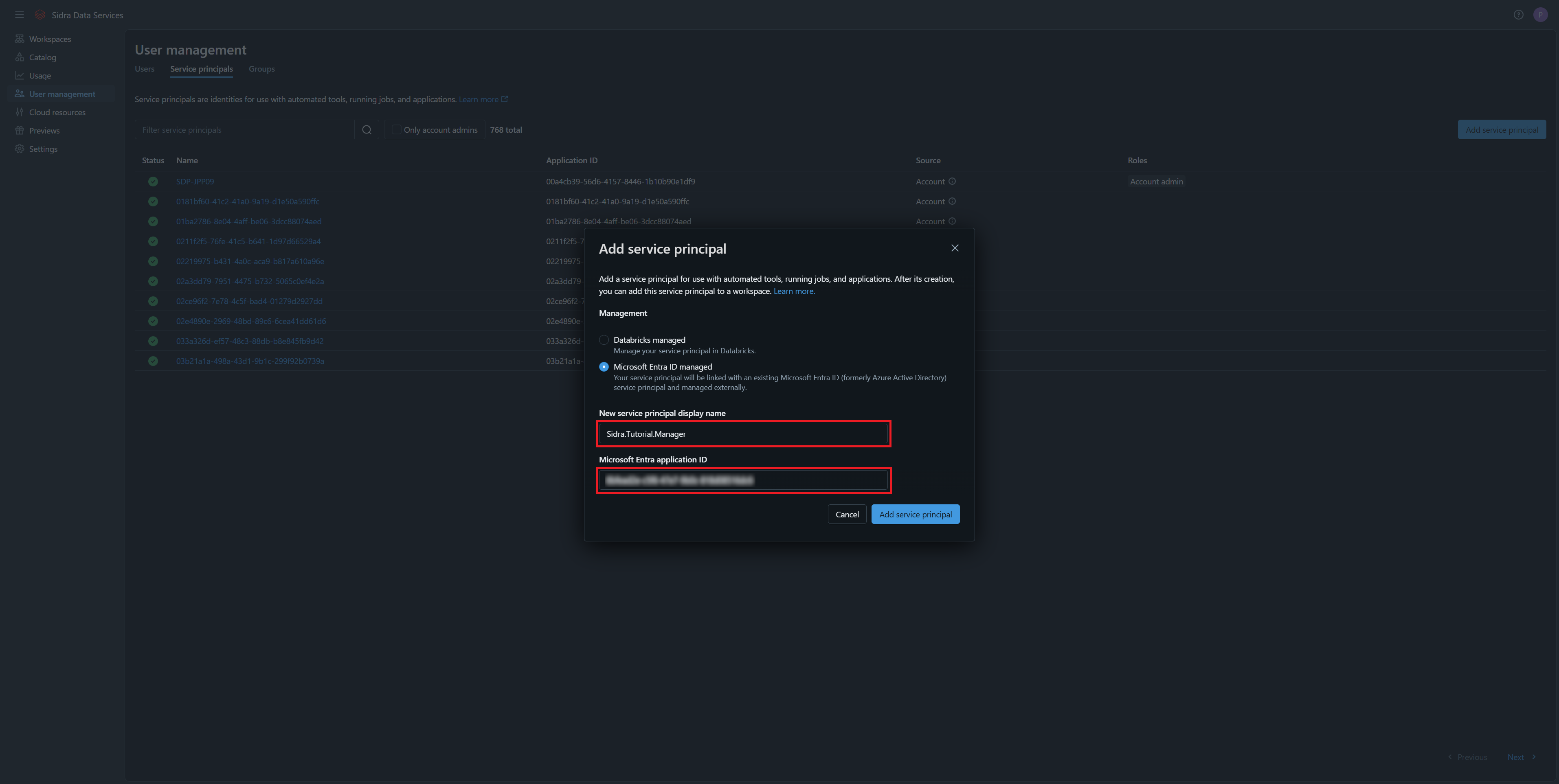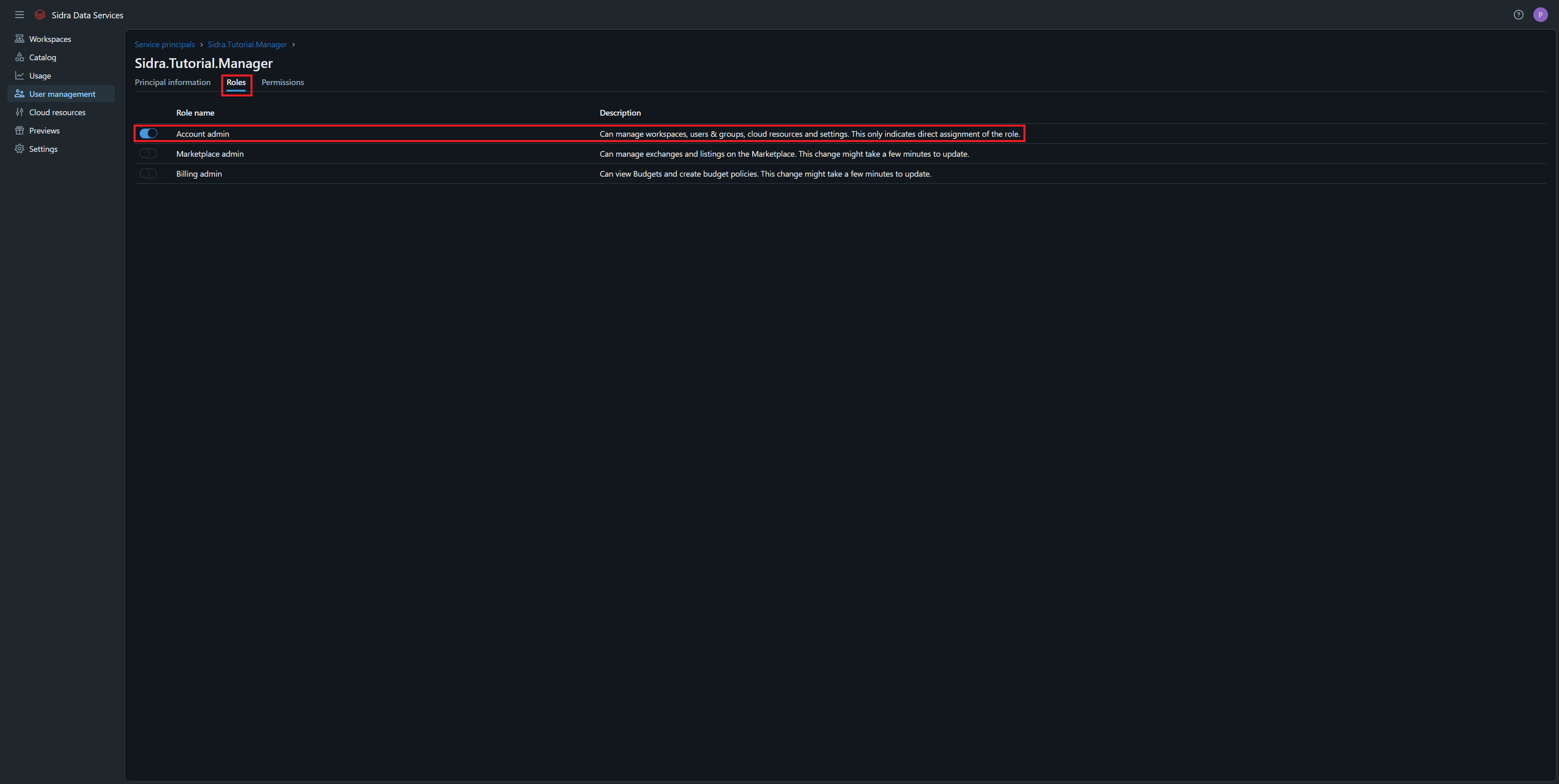 Assign Account Admin to the Sidra Manager Service Principal: