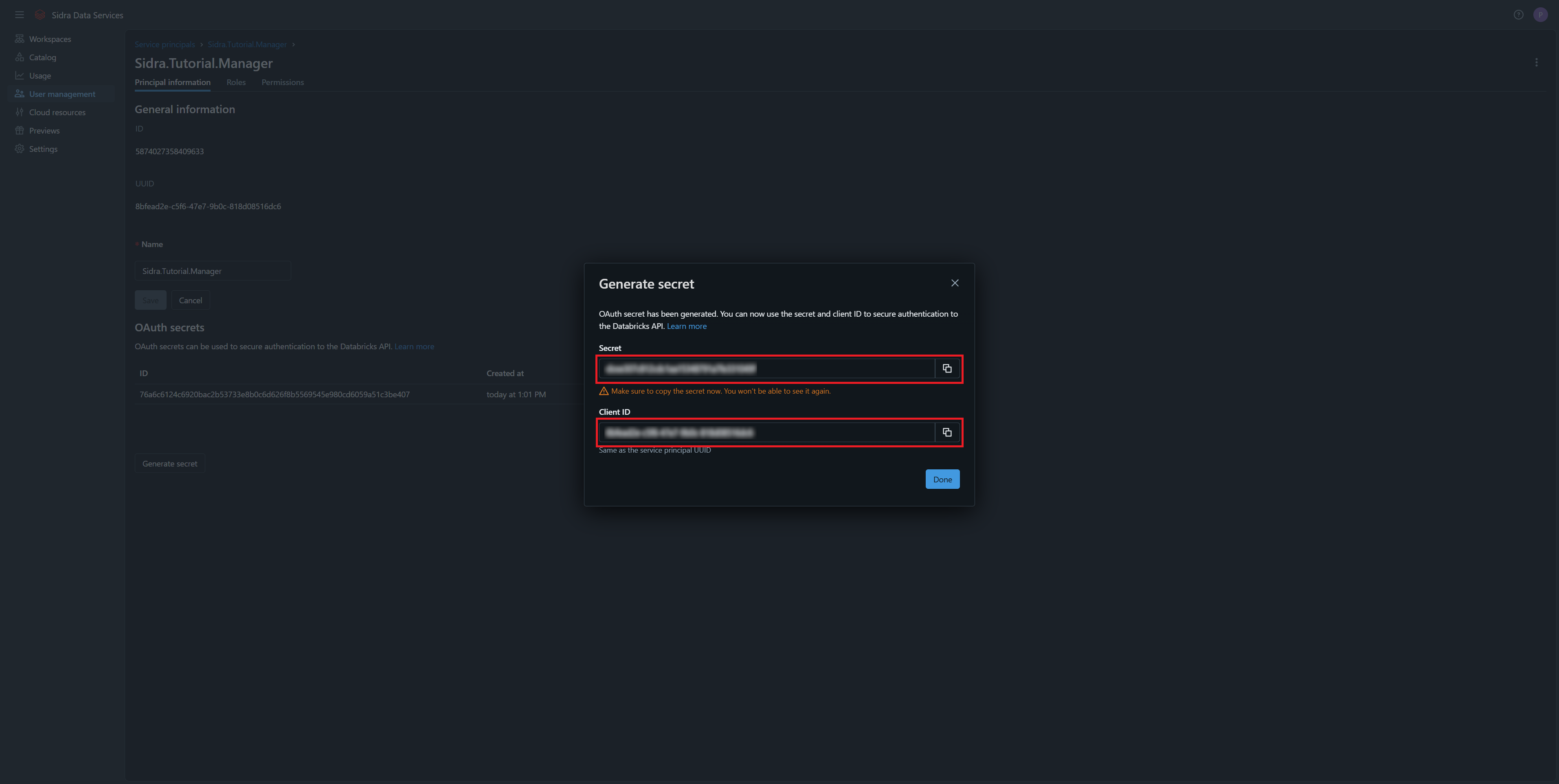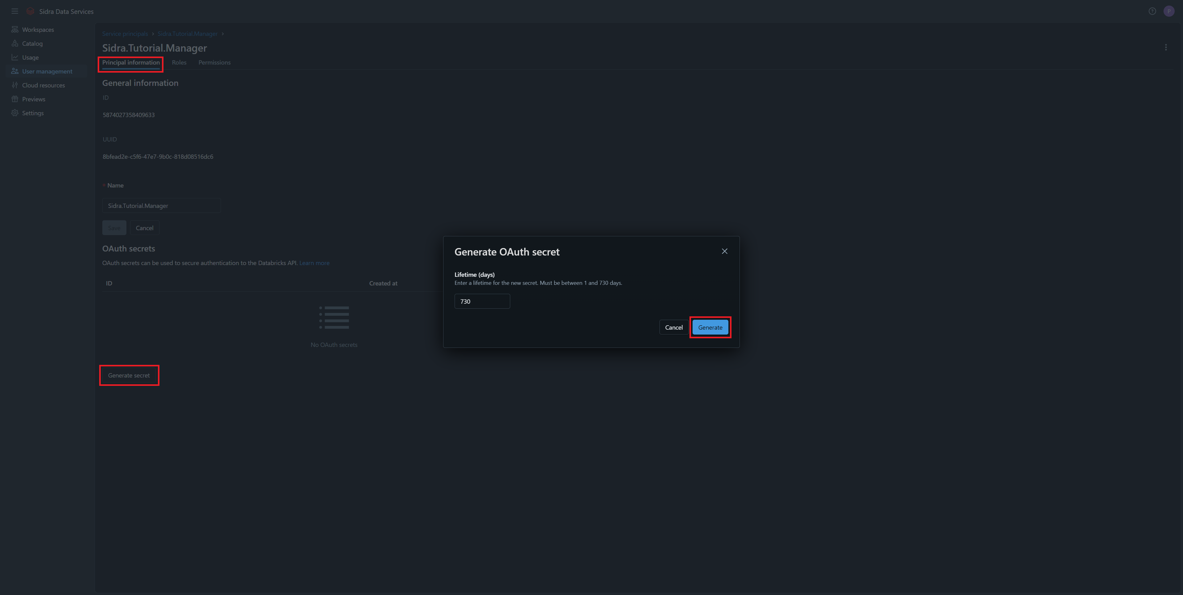 Navigate back to the Principal Information section, and generate a Client Secret. Copy and store it securely, as it cannot be retrieved later: