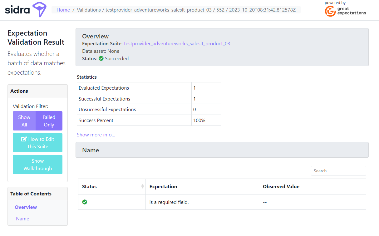 You can find the validation options in the Data Catalog on Sidra Web. Once the data is in the DSU, the validations are performed and quality reports generated on demand.